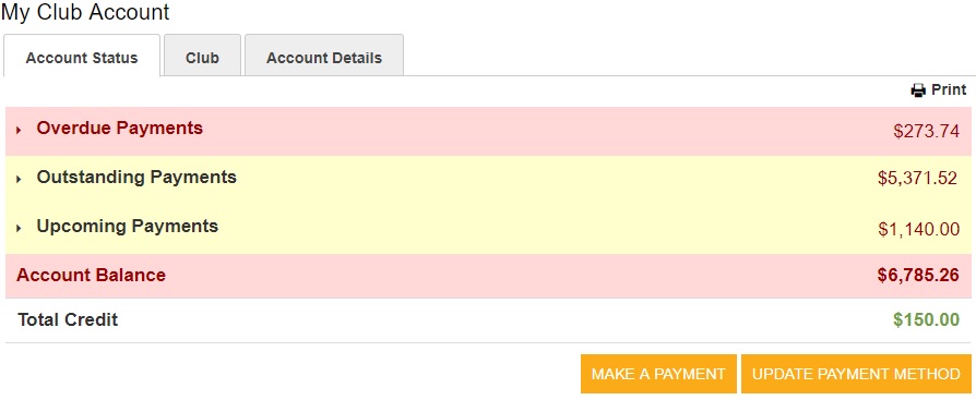 If the club has any outstanding invoices (payments that are “pending” on an invoice), they will be visible right on the club’s main Account Status page.