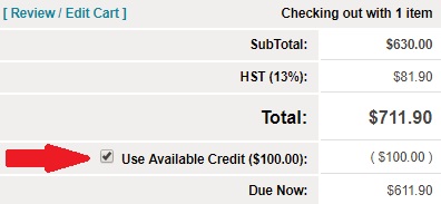 During checkout, "Use Available Credit" will automatically be checked and applied toward the balance due now. Selecting to use the available credit toward a balance of the same or less value will update the amount due now to $0.00 to allow you to COMPLETE FREE ORDER. Selecting to use the available credit for a balance of a higher value will update the amount DUE NOW.