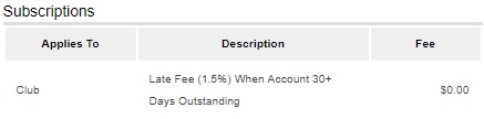 The 1.5% Late Fee for unpaid invoices will appear as a potentially recurring fee. You will see the Late Fee (1.5%) under the Subscriptions heading on your next registration checkout, starting May 16, 2018. On the last day of each month, the club's account will only be charged for 1.5% of the balance owing if it is more than 30 days outstanding. If the club does not have an outstanding balance, then no late fee will be charged.