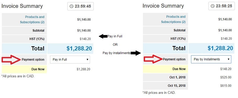 If you select to Pay by Installments, the HST will be due immediately and the sub-total will be due on the applicable date. If you chose to pay by installments, log into My Account to view the Upcoming Payments.
